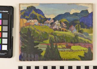 DescriptionBucolic landscape; a farmer and a horse working the field, small colourful village and rolling hills in the background.