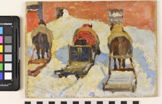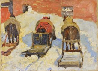 DescriptionBack view of three horses harnessed with simple buggies waiting in the snow.Status