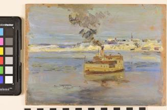 DescriptionScene of a ferry crossing a river, dark smoke coming from the engines, snowy riverbank in the background.Status