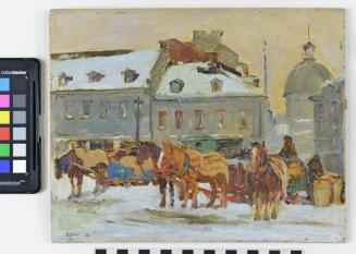 DescriptionWinter scene of horses and carriages waiting in front of the Bon Secours Market in Montreal.
