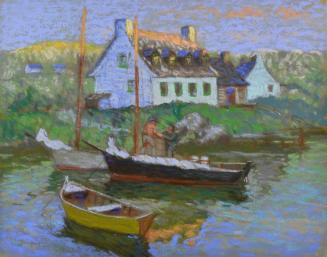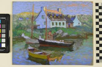 DescriptionMen unloading a small boat moored at a dock, as the sun sets on a small village.
