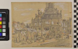 DescriptionPencil and chalk drawing of a busy market scene in Haarlem set in front of the City Hall.Status
