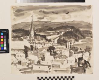 DescriptionView of Chicoutimi North from up high, the church and its bell tower anchoring the scene to the left, rolling hills in the background.Status