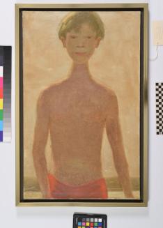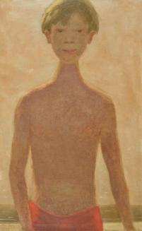 DescriptionPortrait of a smiling, slender young man in a red bathing suit against a cream-coloured background, sliver of a beach visible.