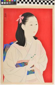 DescriptionPortrait of a young woman on a red background, clasping her hands and wearing picks on her fingers, presumably to play the koto. She wears a white kimono with subtle graphics and a bright blue obi.Status
