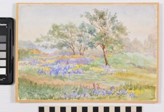 DescriptionA scene from Uplands Park in Victoria, BC. Two trees standing in a field of purple camas.