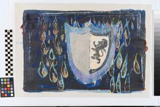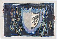 DescriptionBright light blue and white heraldic crest with a lion first half and an empty white second half. The crest is surrounded by colorful drops on a dark black and blue background. Underlayer of writing is visible but not easily decipherable.Status