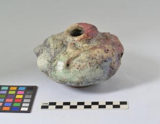 Descriptiongreen, white, red, grey; squat roundish pot with a turned base rim; belly & shoulder heavy with modelling; uneven neck & mouth; inside is rough with raku glaze bubbles; glaze on outside uneven & has crawled & pittedStatus