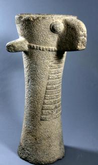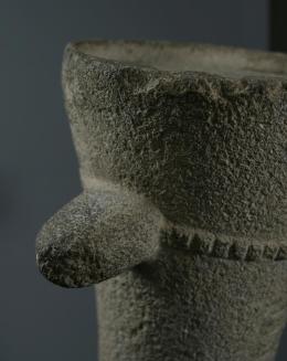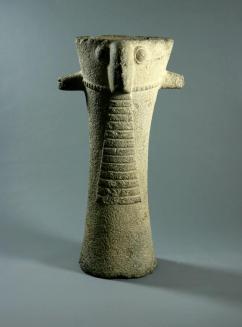 DescriptionGently waisted cylindrical body, flaring at the top and bottom, front carved with a long triangular beard with fourteen horizontal bands, large hooked nose with flat underside, protruding eyes with surrounding lids, wide projecting ears, a notched relief band encircling the head from the lower edge of the nose to the mid-point of the ears and around the back, and top as a shallow bowl for offerings; with a very finely pecked overall surface.Status