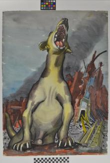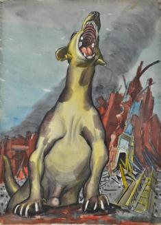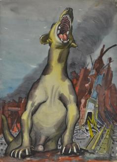 DescriptionA large dog, sitting in the ruins of a house, turns his head upward & lets out with what one imagines as a spine-tingling howl.Status