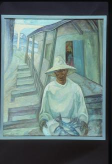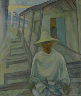 DescriptionA man wearing a white brimmed hat and white shirt, carrying a plate of three fish, behind him is an architectural landscape and mountain in the distance. The work is generally in cool tones.Status