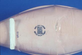 Descriptiona pink figure representing a canoe; hollow interior; gilded on top edge and around opening; exterior marked to resemble birchbarkStatus