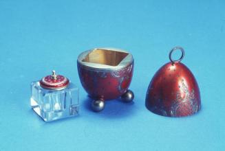 DescriptionAn egg-shaped metal object on three brass balls. Upper part of egg separates revealling a bell in the upper half & a lidded glass in well set into the lower half. Egg is a deep cherry red decorated with incised dots, stars, flowers, & other designs. Incisions are grey. On top of egg is a finger sized right to lift top from. Inkwell is clear glass & square. The lid is round, & is coloured & decorated in the same manner that the egg's exterior is.Status
