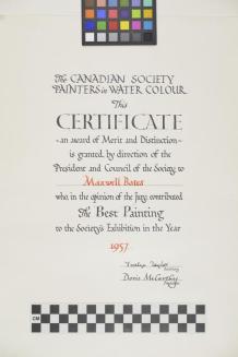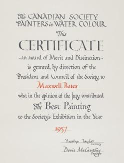 DescriptionCanadian Society Painters in Watercolour award of Merit and Distinction to Maxwell Bates, 1957 "Best Painting".Status