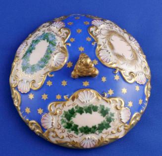 DescriptionBiedermeier style two handled bowl with lid and small foot. Bowl has a gilt inscription on one side and on the other side a multi-coloured scene with people seated in a library? at a table with books. There three medallions on the lid decorated with ivy, forget'me-nots and wheat. Sections in between on the lid and bowl have gold stars on a blue background. Handles and finial are ornate and glazed with gilt. There are many ornate gilt details overall as well as gilt on the interior.Status