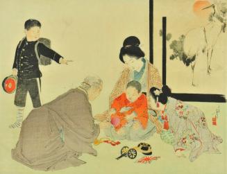 DescriptionLiving room scene with a grandmother and mother playing on the floor with two children. Another child, a boy in a black uniform is leaving for school.Colour: multi-colour
