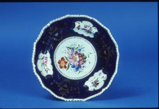 DescriptionDessert plate has shallow well & wide rim with raised moulded edge. Painted decoration consists of a deep blue ground with a large circular reserve in the centre & three mirror-shaped reserves around it, all four containing delicately painted polychrome floral sprays. Gilt decoration is painted on the blue ground between each mirror-shaped reserve, also timmed in gilt with cartouches.Central reserve has a gilt dentil rim.Colour: hite; royal blue; gold; pink; purple; faded green-blue; yellow
