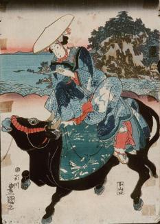 Descriptiontriptych (a): Scene is of a female figure walking on a beach. The figure is dressed in a robe of many different patterns and is holding small square objects in her hands. The lead rope of a bull is draped over her arm. (b): Scene is of a female figure riding on the back of a bull on a beach. The figure is dressed in a blue robe & a wide hat & is holding a pipe. The black bull has a green cloth on its back & a red rope bridle through its nose rings. A mountainous island in the distance. (c): Scene is of a male figure seated on a beach between two woven trunks. He wears a kimono of brown plaid over blue & sandals with no socks. Behind is a rocky island in the water before a mountainous horizon.Status