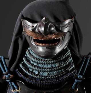 DescriptionHalf face mask with brown lacquer exterior and orange interior has a separate nose section with a hair mustache. Mouth is wide with orange lips and gold teeth. There are four toothed metal neck guards, interlaced and attached to the mask at front with silk braid. Perforations at ears are for attachment of cords. Two L-shaped posts on cheeks and one straight post on cheek (use not apparent). Nose piece is attached by two perforations and two small corresponding posts on the mask.