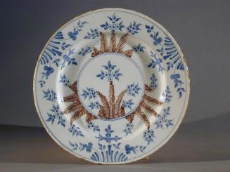 DescriptionPainted in blue & manganese purple on a bluish white ground with ferns & flowers, the so-called mimosa pattern. This pattern was named mimosa only in England. It is actually a sketchy variation of some eithteenth century Chinese designs representing peonies & prunus. The design is repeated in the center between concentric blue lines.Status