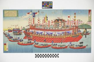 Descriptiontriptych; A large shogan's pleasure boat (Tenchimaru) with two more following in the distance (Ho-o maru and Hachimanmaru), are travelling down the Sumida river to view the cherry blossoms. Lower deck of the boat is filled with oarsmen and the upper deck has the shogan and entourage along with many banners and flags. There are many smaller boats in a line along side.Colour: multi-colour