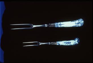 Descriptionsmall two-pronged fork with porcelain handle; painted in underglaze blue with intricate leafy patternStatus