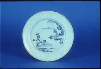 DescriptionPainted in blue & manganese on a bluish white ground with two Chinamen in an Oriental landscape in the well. Peonies & foliage in Bianco sopra bianco on the rim. Yellow edge.Status