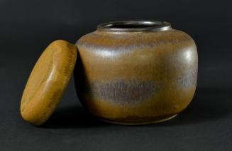 Descriptiongold, brown; squat jar with shallow foot rim, straight sides, wide flat shoulder, wide mouth, short neck, no lip; lid has a flat top and steep rounded sides & it covers & rests above the neck & pot