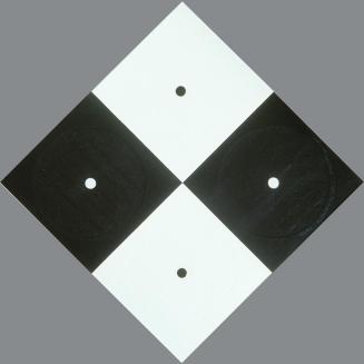 DescriptionFour squares of paper (2 black & 2 white) each blind printed with a textured mandala & pricked with a needle are pasted together to form a large checker board square. In each case the black square had a small white circle & white square a black circle glued to the center of the mandella.Status