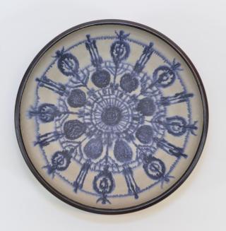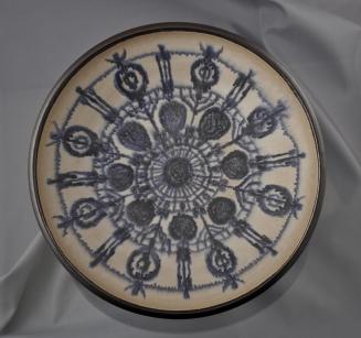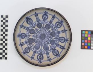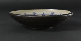 Descriptionbrown, white, blue-purple; shallow bowl with foot rim; dark brown outside, well has white ground with radiating design drawn in blue-purple; glaze in well is matt.
