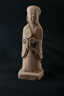 DescriptionFigurine of standing court official in robe holding at front an item with spiral and circular details. Rests on small rectangular base.Status
