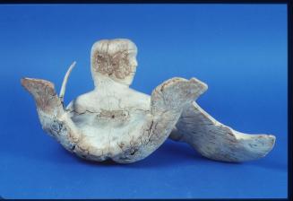 DescriptionA man sitting with his legs spread out in front of him. At one hand is a seal & in the other hand he holds a spear or knife which is inserted into a hole in his hand & tied with a thong.Status