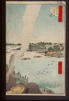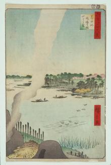 DescriptionLandscape with two boats ferrying people across a river. On the near shore is a smoke column rising from between two rocks, on the far shore are yellow roofs & trees, beyond are pink trees at the right, at the left on horizon are blue mountains.Status