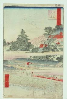 DescriptionOutdoor scene with water in the bottom left on the bank above are people among buildings, above & to the right is a landscape with steps leading to a building. Cloud forms cross horizontally at image center, & partially at lower right.Status