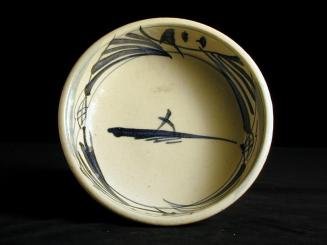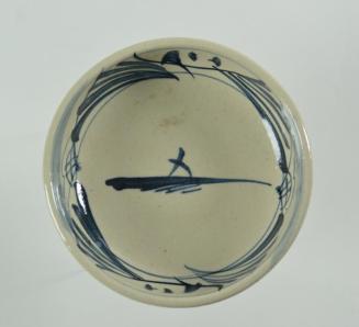 DescriptionBowl has straight sides & is creamy buff body with underglaze blue abstract decor, transparent glaze. Bottom unglazed.Status