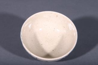 DescriptionUnderglaze blue painting on upper portion of outside rim & clear glaze reveals greyish buff stoneware body. Curved sides