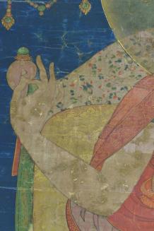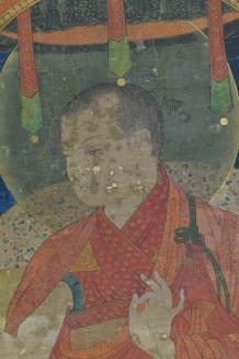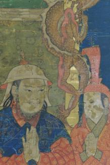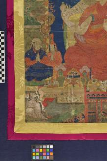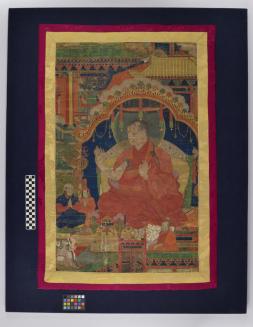 DescriptionPicture bordered by gold braid, gold coloured silk & fushia coloured silk. Phakspa was a contemporary of Kublai Khan, seen sitting at the left with his wife. Phakspa was the Khan's religious teacher. A Monk, to the right, making the eight auspicious offerings.Status