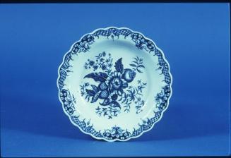 Descriptionwhite, blue; petaliform rim with elaborate diaper borderPattern: Pine Cone