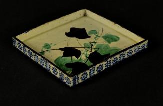 Descriptionsquare; overglaze green & brown-black enamels (ivy design) on white; blue on white floral motifs outer surface/edgesStatus
