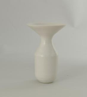 Descriptionwhite; bottle shaped body with flat base, wide straight belly, narrowing to the neck, the mouth & lip flaring dramatically to a funnel shape; same glaze inside & outsideStatus