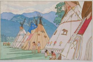 Descriptionfive decorated Plains Indian tipis with native men, women & a child in front; tipis are on a green field; background has green & blue mountains; tipis comprise most of the imageStatus