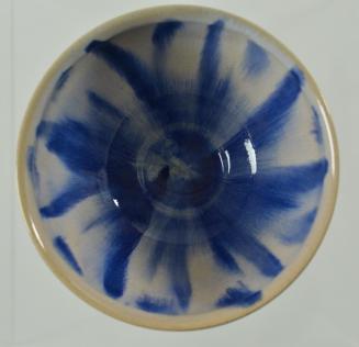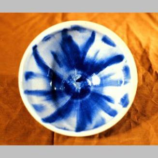 Descriptionblue & whitish blue; steep sided bowl rounded in, then slightly flared at rim; short base rim; unglazed base; crystal like formation (from galze) bottom of interior well; crackled glazeStatus