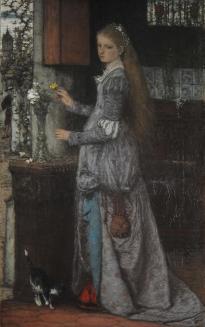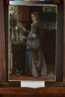DescriptionA young woman stands by a table & absently arranges a few flowers in a tall vase. She wears a floor length dress & there is a cat at her feet.Status