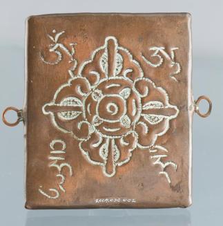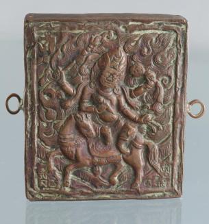 DescriptionRectangular shrine has a raised relief (repousse) image on the front of a figure with four arms on a horse, carrying an excorcism dagger in one hand and surrounded with flames. There is a four pronged motif with Tibetan characters on back and two metal rings protrude on either side. Possible devotional materials are enclosed inside the shrine.Status