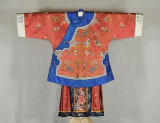 DescriptionThis is a shorter coat made of plain red silk, with a blue silk border, and embroidered in various shades of blue, red, yellow & green motifs of butterflies(symbol of joy & summer, also wishes for long life), peonies(symbol of wealth, love & beauty), 1 ingot & circular gold ornaments(1 of the 8 Precious Things, 1 a lucky symbol), orchids(symbol of love, beauty & progeny), book scrolls(good augury, being one of the 4 accomplishments of a gentleman), melons(symbol of progeny), and the lingchih(immortality fungus). The white sleeve cuffs are decorated with embroidery of similar auspicious symbols like peaches(symbol of longevity), ling-chih, bamboo(evergreen, therefore emblem of longevity), plum blossoms(symbol of longevity & winter), butterflies and phonixes(1 of the 4 supernatural creatures).Status