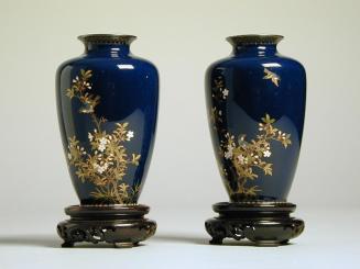 Descriptionblue enamel with gold, green, white, blue, red & brown motif of a bird in a blossoming tree & 1 bird flying; cloisonne on silver; wooden standStatus