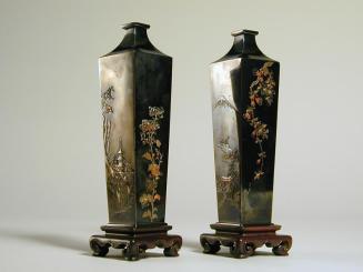 Descriptionvase is square in x-section narrowing on all sides to a square base; has a tapered square neck; possibly silver, toned midnight blue; applied tooled silver & gold; incised & inlay elementsStatus