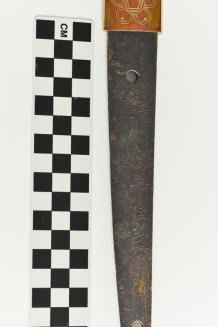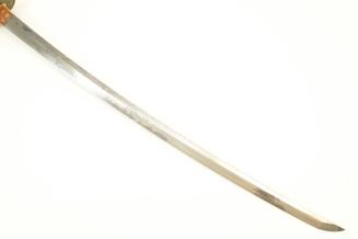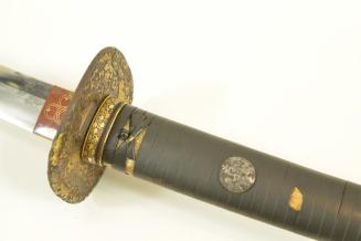 Descriptionsword with steel blade; a reddish (metal?) piece (habaki) near tsuba has a stylized flower design on one side & a similar piece on the other side has writing; the hilt is ray skin wrapped with leather & has metal decoration; the case is lacquered wood with a metal end pieceStatus