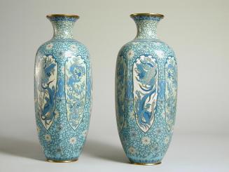 Descriptionrounded, six sided vase; blue & white enamel; bird & dragon motif on alternating panels
