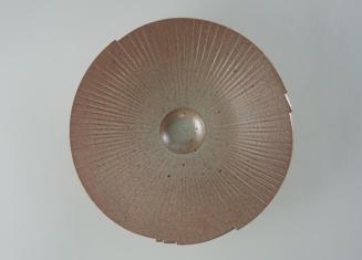 DescriptionShallow circular bowl with a carved stepped rim, and a small base and foot; interior is carved with lines radiating from a small circular well at centre; overall glaze of reddish brown and beige with speckles;
